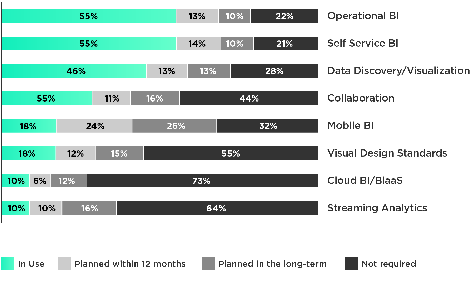 Self-service BI is being used much more than other current trends like collaborative BI (29% of users) and mobile BI (18% of users). All of these receive equal attention from the media and marketing from Business Intelligence software vendors.