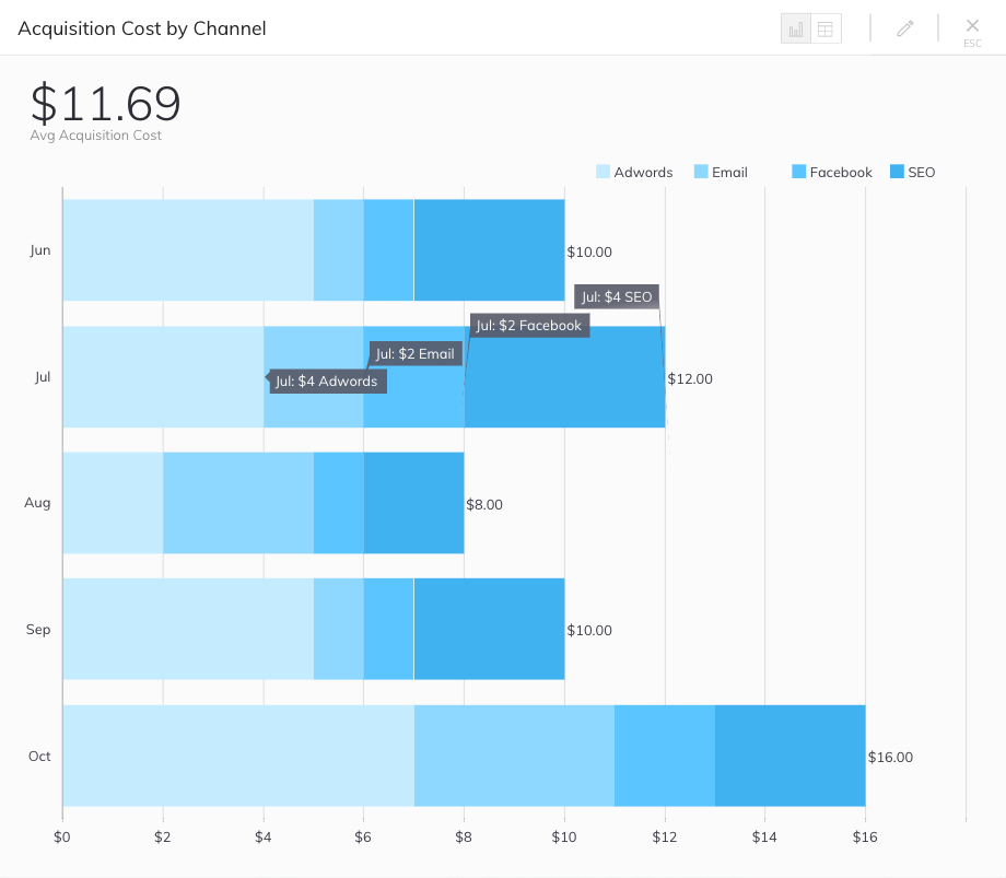 Setting up a CACPC metric as a column and line chart makes it easy to compare market spend for each channel, along with how successful each channel is at adding new customers.