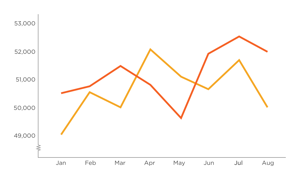 It’s still important to call out the adjusted axis to your audience, but since the attribute of length is less prominent on a line chart, viewers are less likely to be misled.