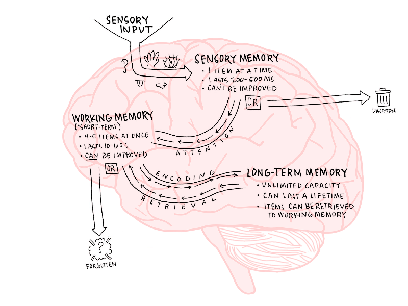 The real power of perception, however, is the sensory memory. Without it, we would have to consciously process everything we see (or hear, taste, smell, or touch) in our working memory. Remember, the working memory has a limited capacity and duration. This burden would be enormous and overwhelming.