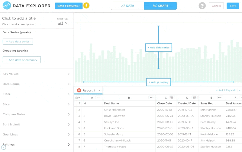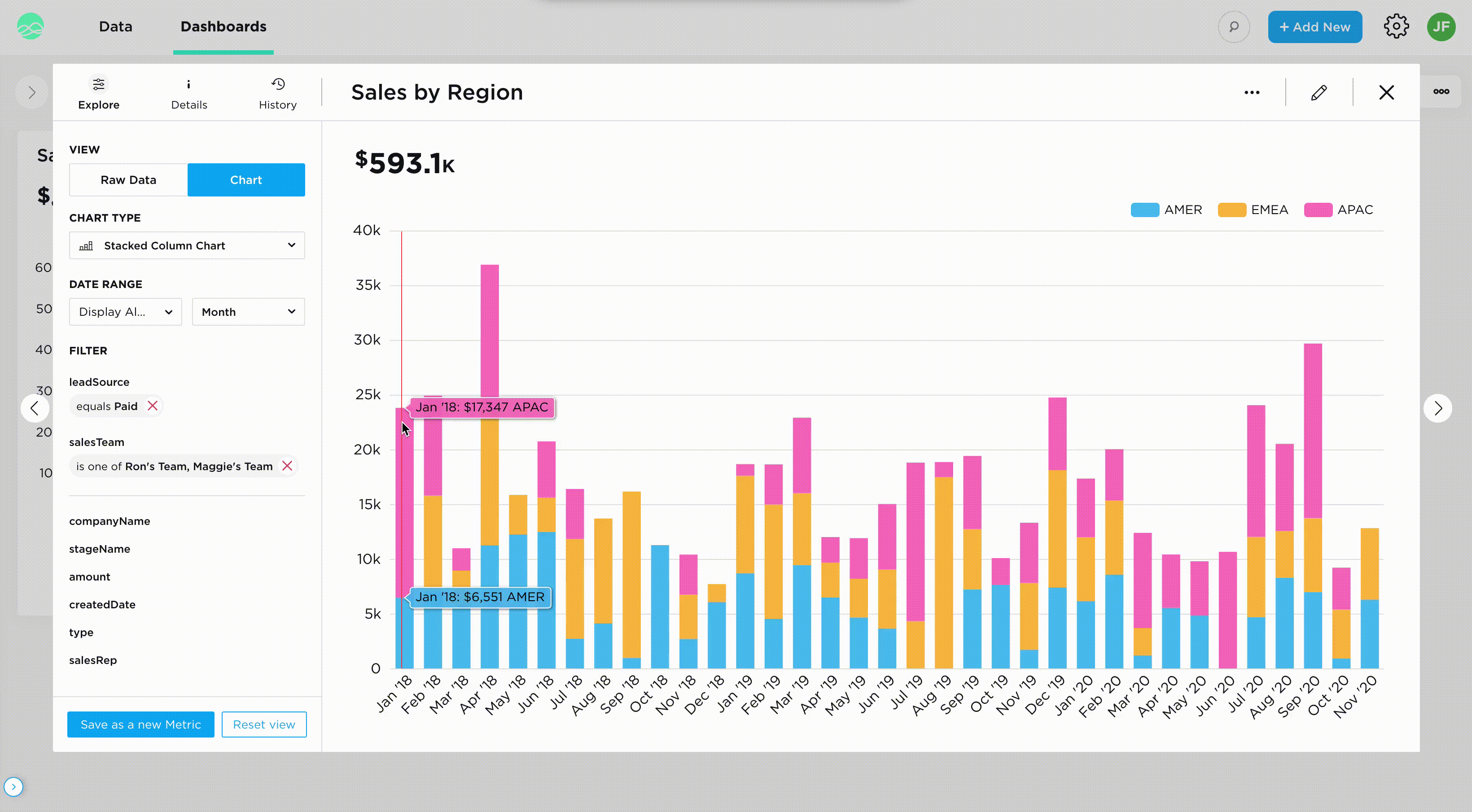 One good question always leads to another. Data Explorer is a new way to build metrics. Instead of having to change your data to answer a specific question, Data Explorer lets you indicate which columns you are interested in, and then change the groupings, slicing, filters, and visualizations on the fly. The transactional data is always preserved so you can always see the individual items that make up the number. Instead of answering one question with one metric, you can answer hundreds of questions.