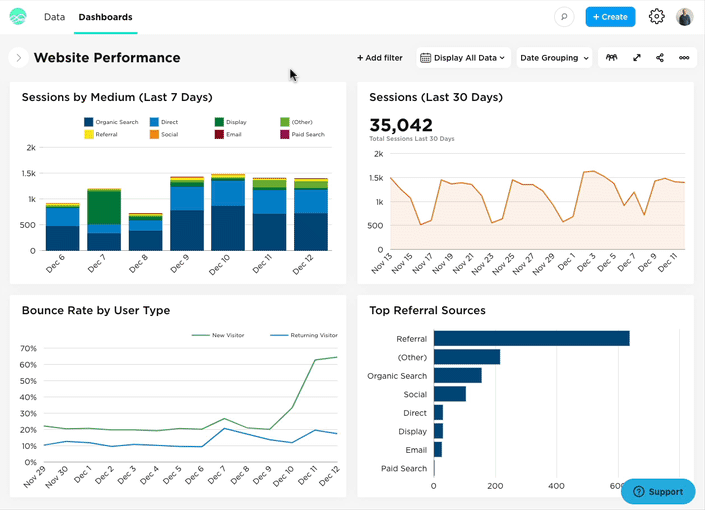 Change the date range, date grouping, or add filters to all metrics on a dashboard with a few clicks, directly on the dashboard.