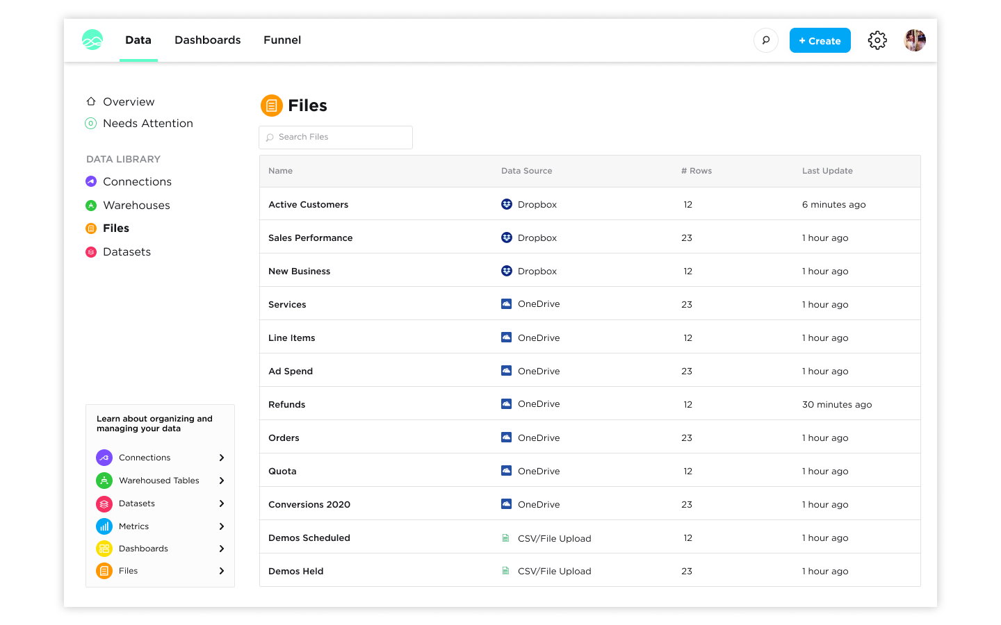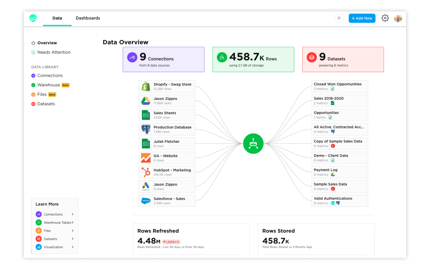 Data is the lifeblood of your business and the Data Overview page is the place where you can see and manage it all. Here you can see your all Connections, Warehouse tables, and Datasets. Manage access to connections, see when Warehouse tables last updated, and verify Datasets.
