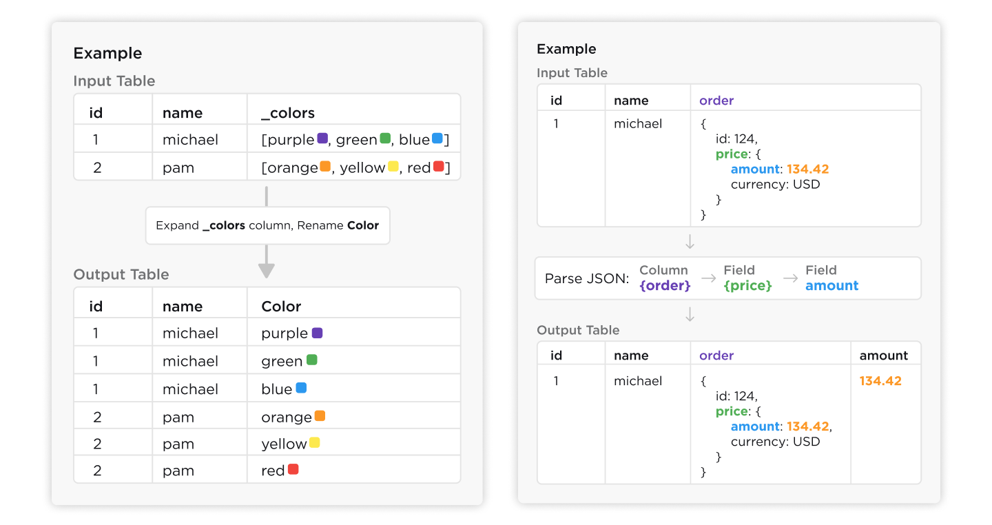Transforms allow you to clean and prep your data without knowing SQL. Many APIs return data structures instead of clean rows. The new JSON and Array transformations help you to format your data as clean usable rows. You can use the new transforms to break out JSON and Arrays into rows. You can define the JSON keys, all without knowing SQL.