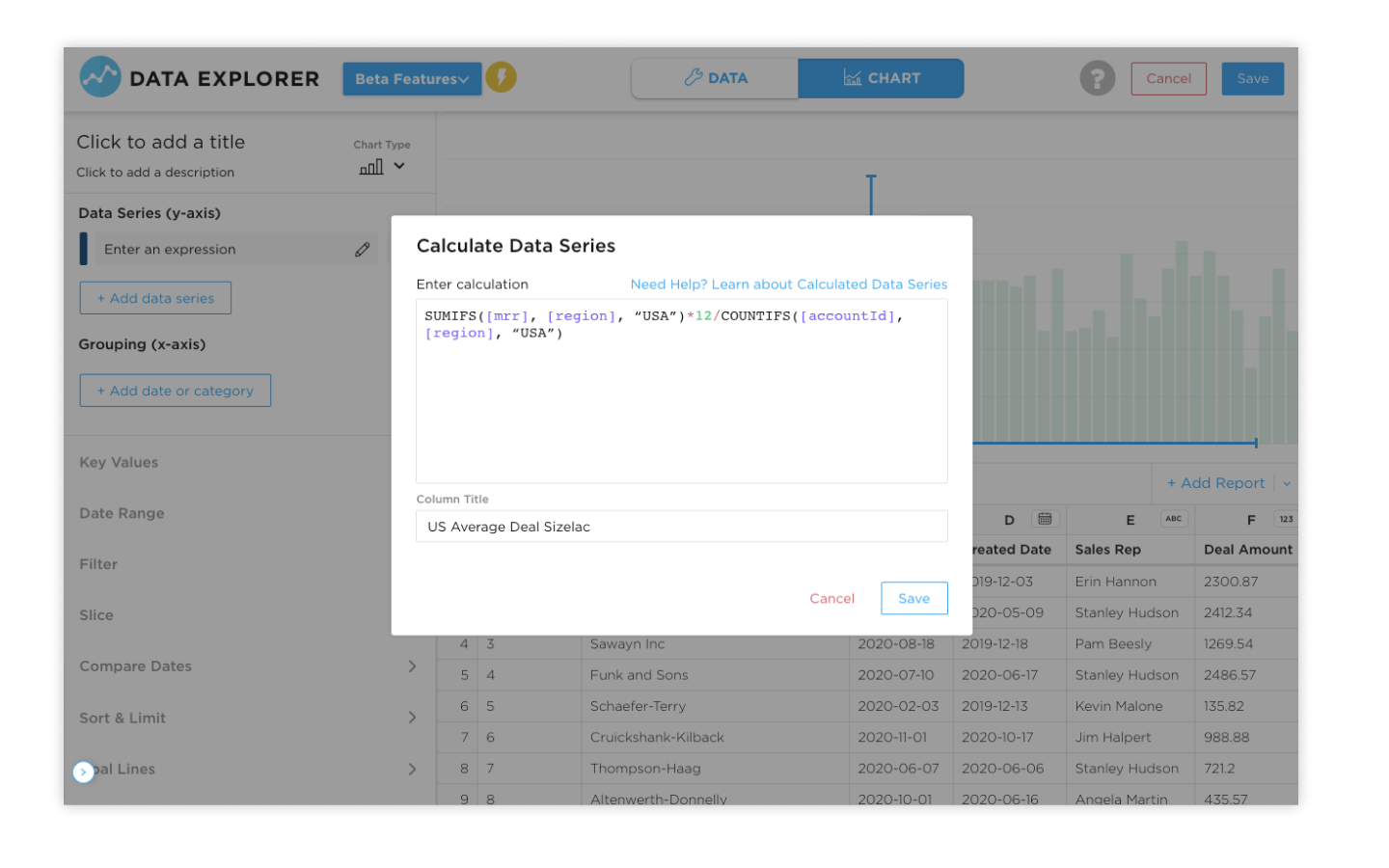 Instead of just choosing an column in Data Explorer, you can open the ‘Calculate a Data Series’ modal. There you can use familiar Excel and Google Sheet like syntax to answer your questions.