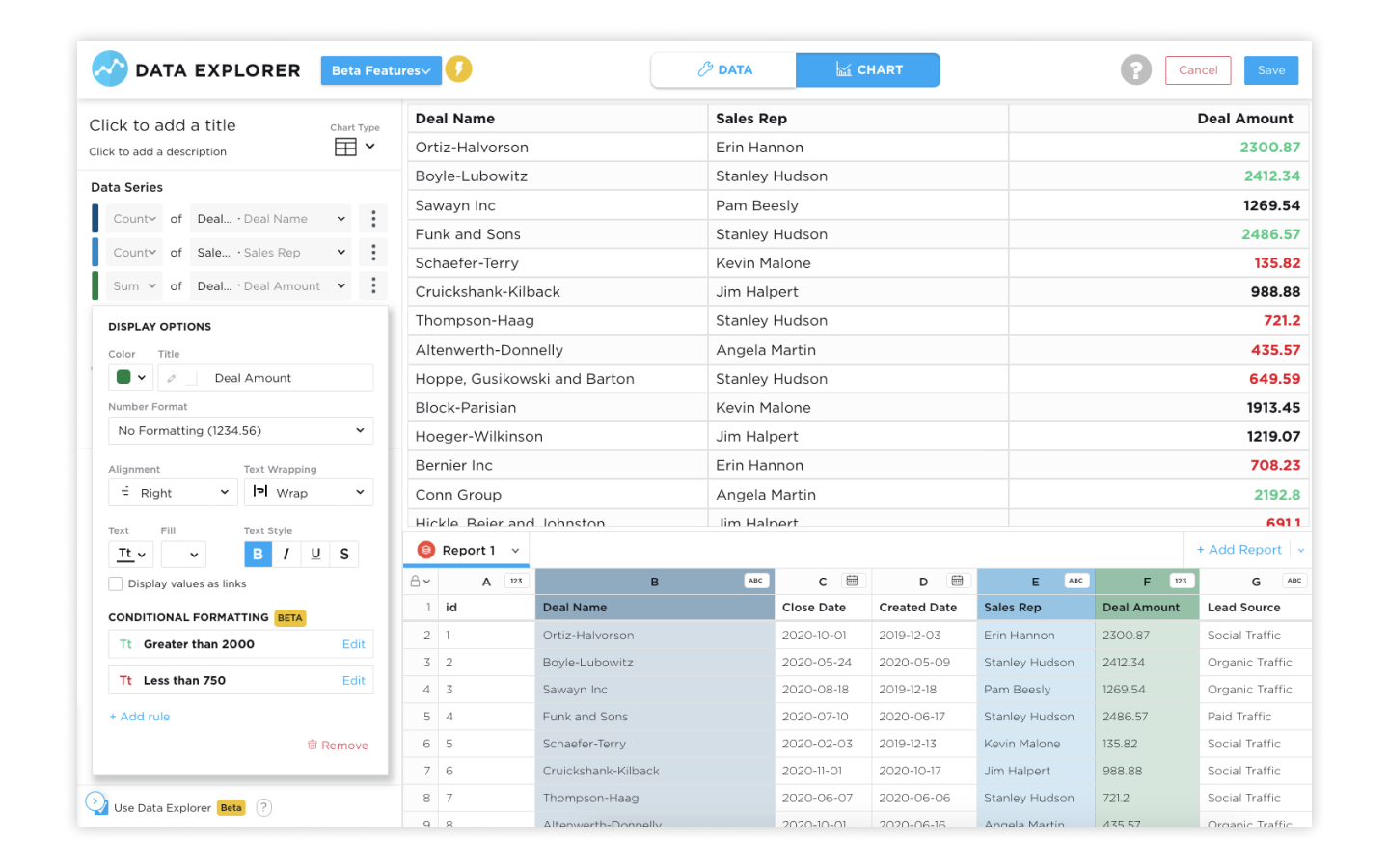 Having to visually scan your data for anomalies or checking each row of a table mental against it expected value takes a lot of time. Conditional Logic allows you to set rules and then format your table against those rules. Show high performers in green or areas that need attention in yellow. If a number is below a goal, it can be bolded and the background turned red.