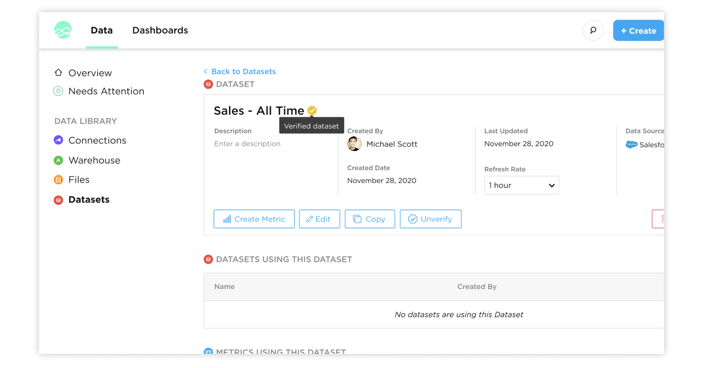 In the Data Tab, click on a Dataset. The new Verified button, when clicked, will add a verified badge to the Dataset name that appears in 4 locations: