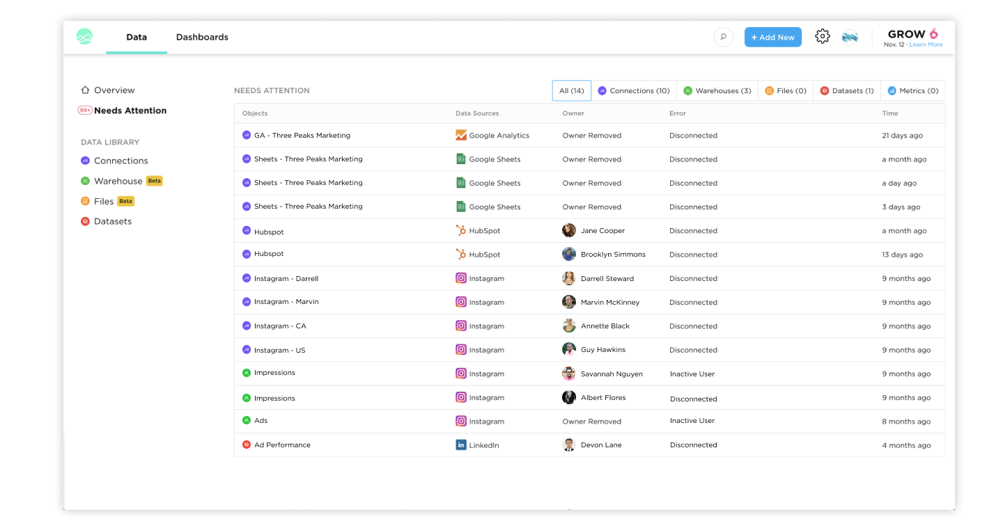 Pulling and getting insights from your data can be complex. When things go wrong, they pop up on the Needs Attention page so you can fix that fast. The Needs Attention page surfaces Connections, Datasets, and Metrics where something went wrong and need an analyst or admin to fix them. Instead of having to hunt through your account by hand as you maintain your data, all the items that need your attention are presented to you.