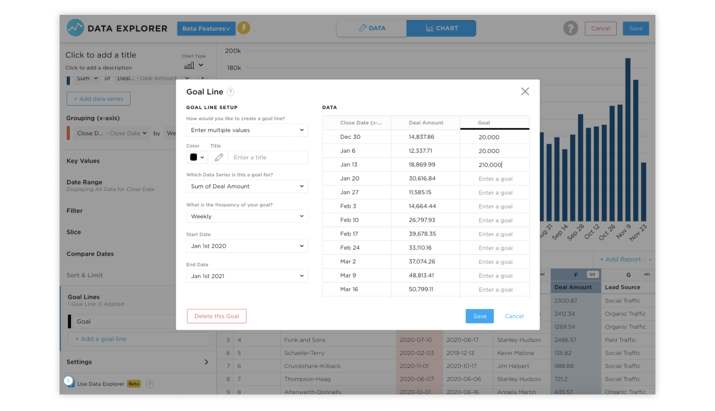 In the Data Explorer, you can add a dynamic goal. Set the time period and group you are defining your goal for. For example do you have weekly, monthly or quarterly goals.