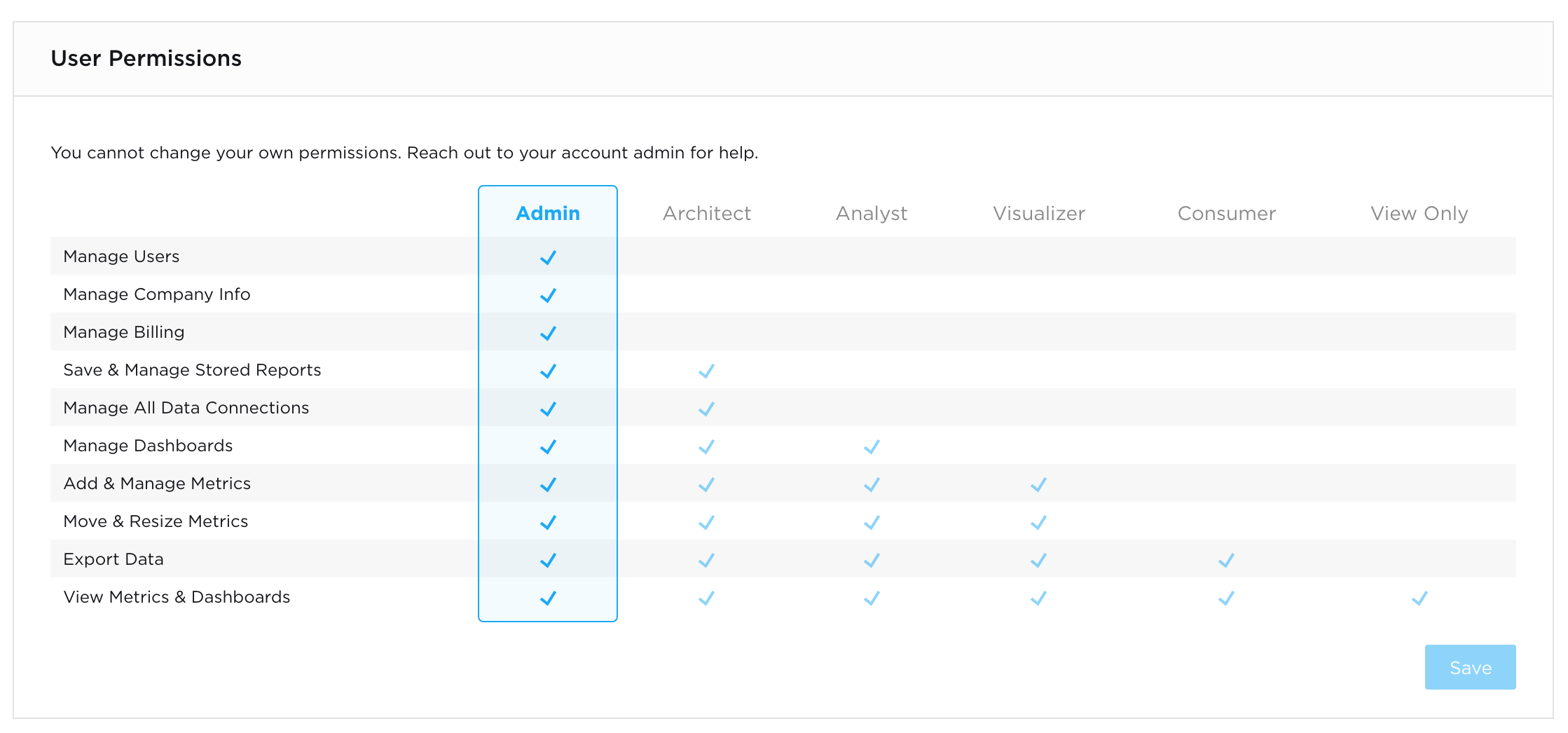 Everyone at your company should be able to use data to make decisions. However, you may need to control who has access to what, and with what capabilities. With our new upgraded User Permissions, you can easily assign users to 6 new roles that make it clear, what they can and cannot do.