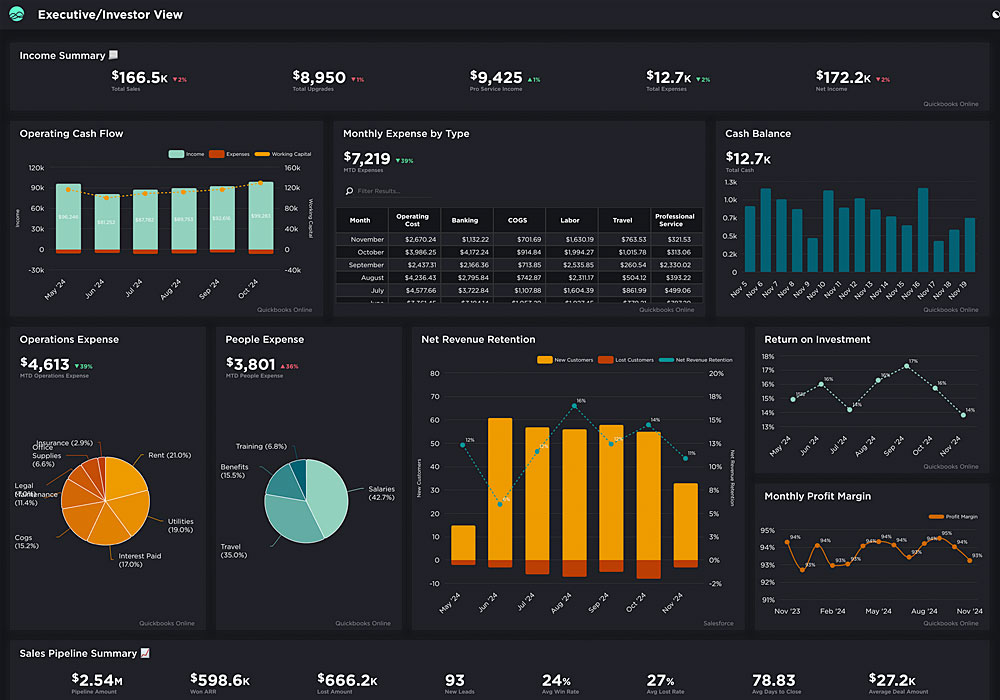View DashboardRevenue, sales, expenses, return on investment, profit margins, sales pipeline summary, avg deal amount, social media follower summary, ad spend and ad conversions.