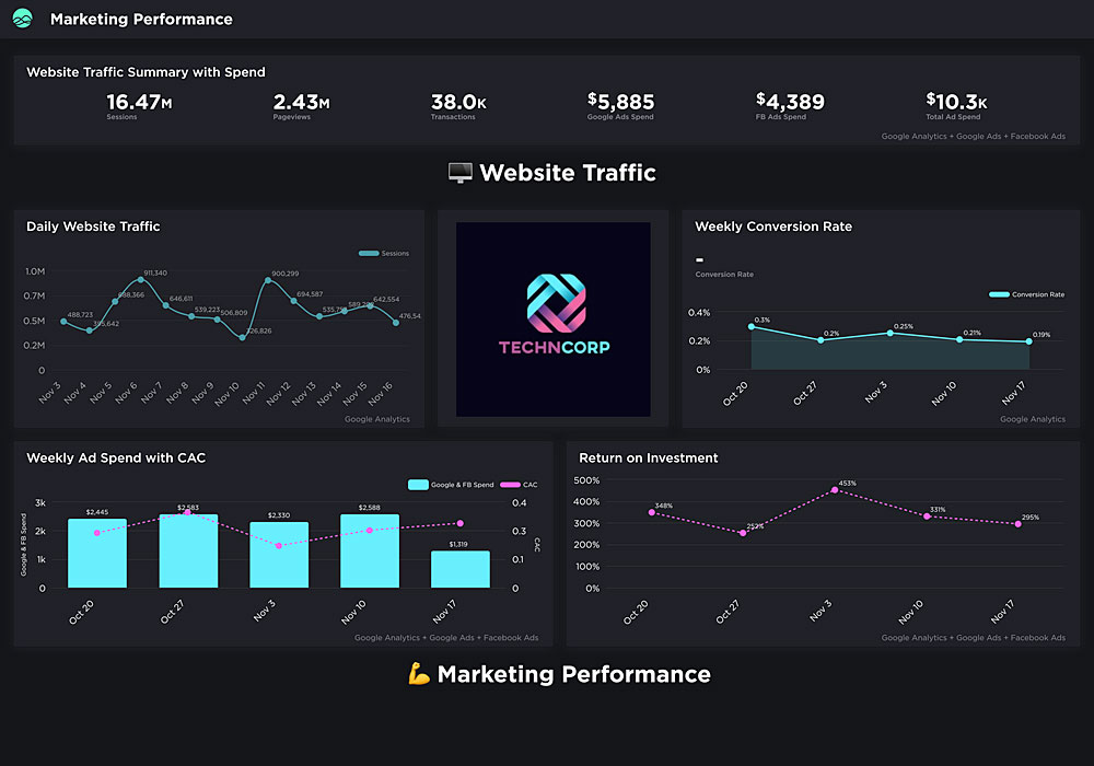 View DashboardWebsite traffic, ad spend with customer acquistion cost, return on investment, email marketing performance, ad spend.