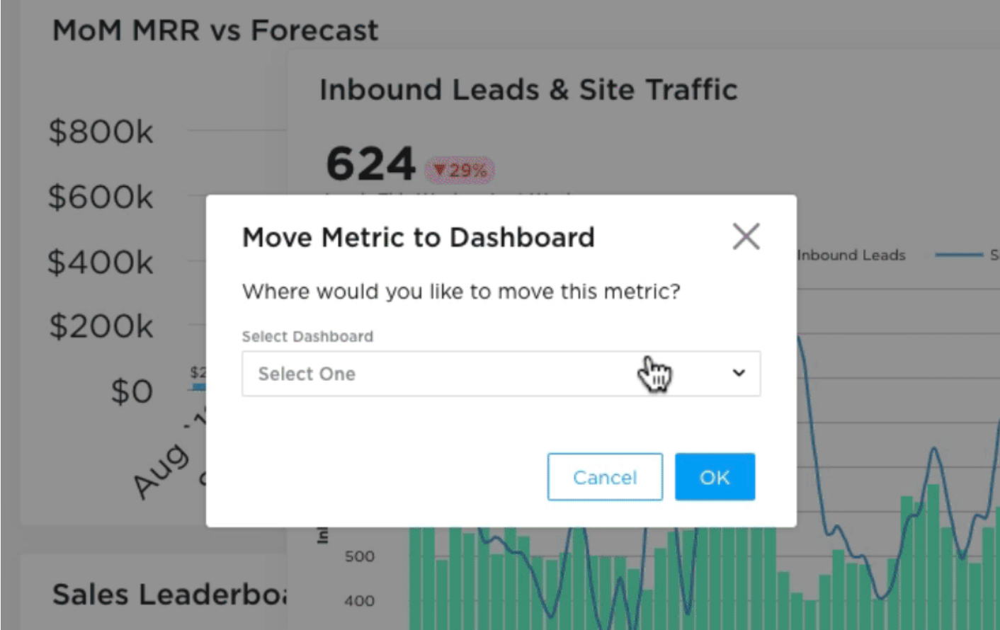 You can move a metric from one dashboard to another in Grow by clicking on the metric's action menu and choosing "Move Metric." You'll see a list of your dashboards in a new window, and you can select the one to which you want to move the metric. It’s as simple as that.