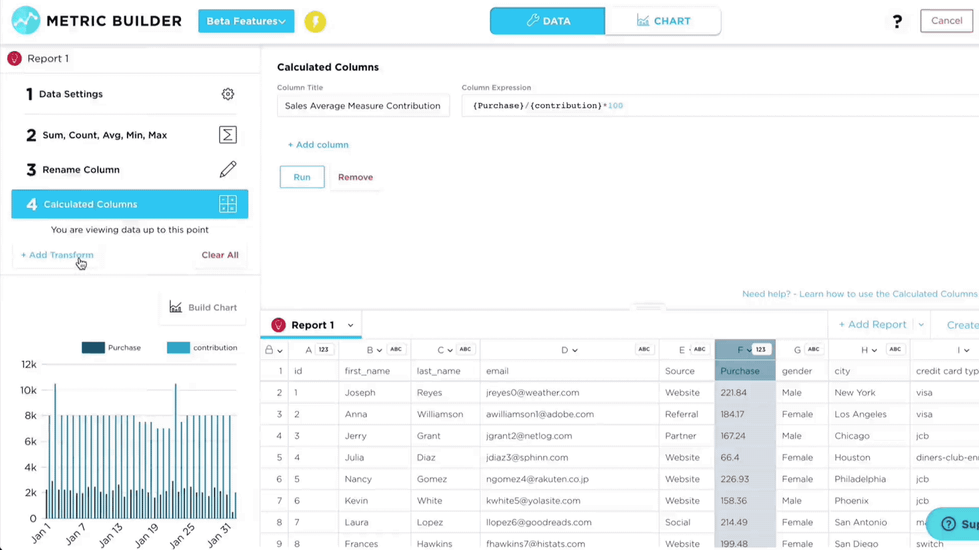 Once your data is imported, it's easy to prepare, cleanse, & transform data—allowing you to blend multiple data sources to fuel metrics and dashboards. Grow supports the following transformations: